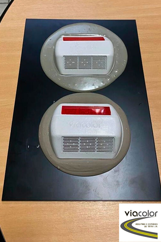 e o Catalizador líquido – em bisnagas plásticas especiais que permitem o lançamento integral do conteúdo da embalagem na lata para uma correta mistura, permitindo o tempo ideal para aplicação de todo o conteúdo da lata antes do processo de cura. Trata-se de um produto com grande estabilidade quando mantido nas condições de armazenamento e transporte recomendado pelo fabricante. A COLA BICOMPONENTE POLIÉSTER PARA TACHAS E TACHÕES VIACOLOR é um produto ecológico à base de resinas naturais e/ou sintéticas, que após a devida mistura dos componentes, promove a adesão por reação química controlada. É recomendado para a fixação de tachas e tachões de demarcação para rodovias e via urbanas, em pavimentos flexíveis e rígidos, em especial para tachas e tachões em Poliéster. Indicado para situações de tráfego medianamente intenso e quando se pretende boa resistência na fixação dos elementos. Sua fórmula foi especialmente desenvolvida para proporcionar uma fácil aplicação e para que os elementos possam suportar as adversidades climáticas e condições de tráfego, evitando o descolamento, conferindo alta resistência à fixação, resultando em alto desempenho. A COLA BICOMPONENTE POLIÉSTER PARA TACHAS E TACHÕES é resistente ao intemperismo e à radiação ultravioleta, quando exposto a condições ambientais normais até a temperatura ambiente de 70º C, mantendo-se resistente à impactos e ao arrancamento. Apresenta grande impermeabilidade à penetração de água, mesmo quando submergido em longos períodos. Oferece grande durabilidade em condições úmidas e secas, sendo bastante resistente ao arrancamento a que os elementos fixados estão expostos pelos impactos, apresentando resistência à abrasão. É compatível para aplicação em pavimentos betuminosos e de cimento – quando tomados os cuidados preconizados para o caso. É sabido que a qualidade dos adesivos é fundamental à manutenção de tachas e tachões no pavimento. Assim, a implantação deve ser feita por pessoas capacitadas, com serviço obedecendo critérios de qualidade e na temperatura correta de aplicação. Como o pavimento apresenta influência direta na coesão entre tacha e/ou tachão, recomenda-se a limpeza e remoção de contaminantes e sujeiras antes da aplicação do adesivo no pavimento. Nos casos onde as tachas e tachões tem corpo em Poliéster, o VIACOLOR ADESIVO BICOMPONENTE POLIÉSTER PARA TACHAS E TACHÕES substituí os adesivos bicomponentes à base de PMMA ou aplicados a quente (termoplásticos) com vantagens e excelente custo-benefício. Antes da aquisição, consulte a Assistência Técnica Viacolor para as melhores orientações.