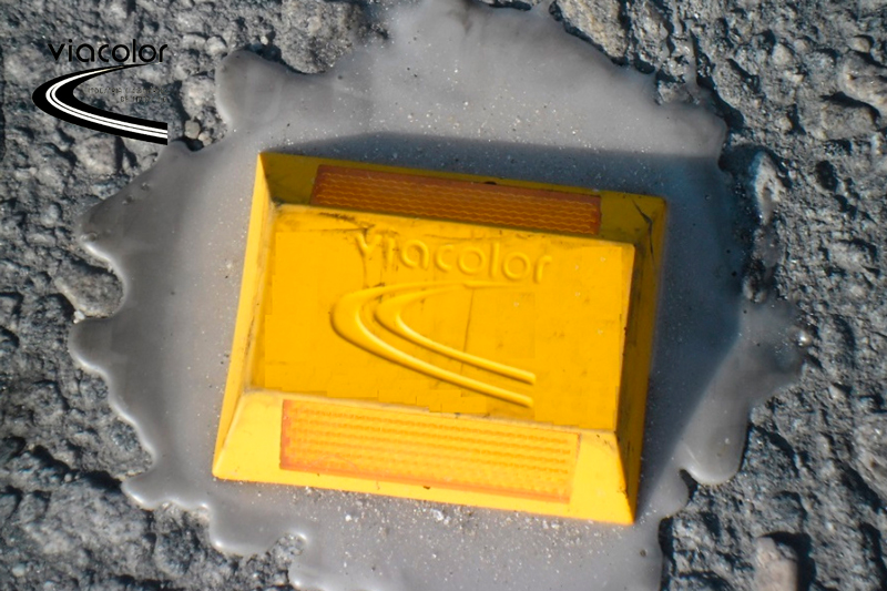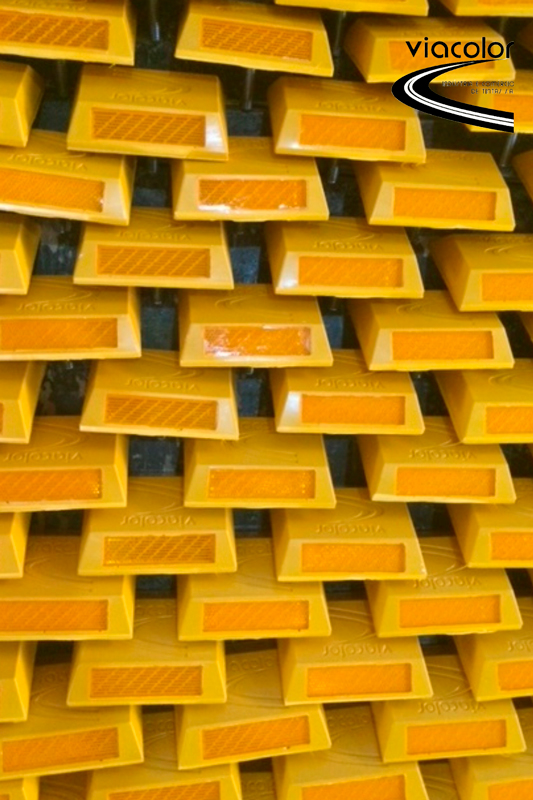 atendem integralmente as Normas ABNT quanto aos tipos I, II, III e IV, com lentes prismáticas e com proteção de vidro ou verniz. Devido conter pinos, o assentamento deve se dar com a furação do pavimento, fator que permite seu assentamento com qualquer tipo de adesivo, sendo altamente recomendável a utilização da cola bicomponente a base de Poliéster, que oferece um excelente custo benefício. A existência do pino permite que a fixação resulte firme e resistente ao impacto e ao arrancamento. O assentamento pode se dar com qualquer tipo de cola para fixação deste tipo de elemento – Poliéster, Asfáltica, Termoplástica ou cola especial a base de Metilmetacrilato – PMMA, que fornece uma resistência maior que os adesivos tradicionais. Seu ângulo de entrada com a lente à 45º favorece a proteção da lente e permite uma alta retrorrefletância dos elementos, mesmo sob condições climáticas adversas, como chuva e neblina. As tachas são compactas e de grande eficiência. As TACHAS DE POLIÉSTER COM PINO 45 VIACOLOR são fabricadas em resina poliéster especial, com adição de pigmentos resistentes ao intemperismo, preservando a cor original durante toda a vida útil do elemento. Com alto controle de qualidade e a utilização de matérias primas puras, apresentam alta resistência mecânica à compressão – superior à exigida pelas Normas, possuindo reforços internos, com base lisa que permite maior aderência à cola e melhor fixação ao pavimento, conferido maior resistência e durabilidade. As lentes prismáticas de alta refletância apresentam índices superiores aos exigidos pela Norma.