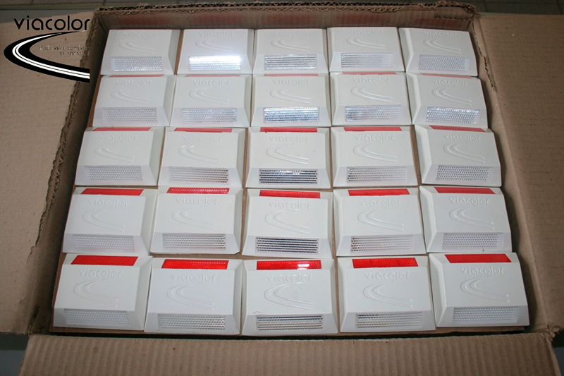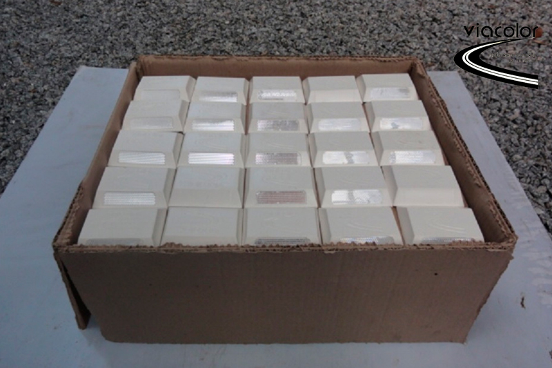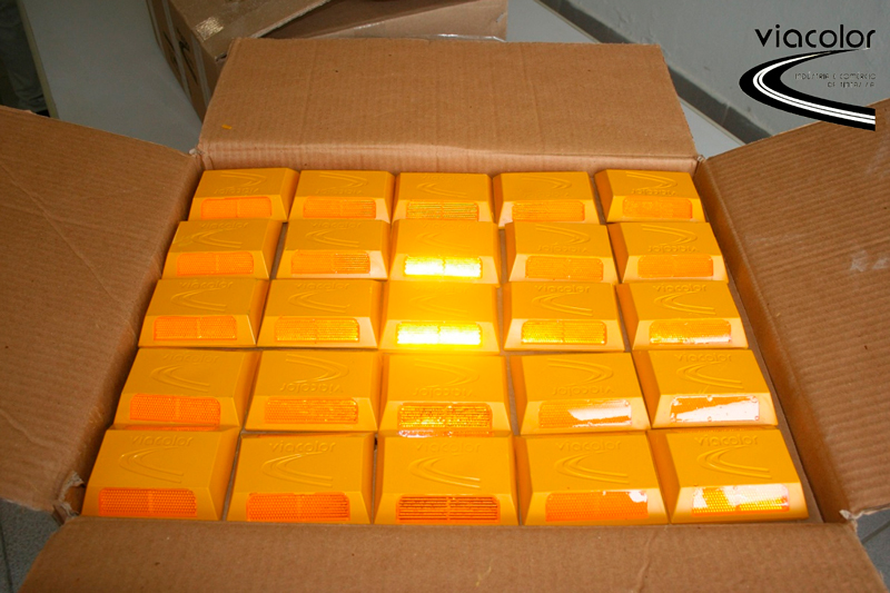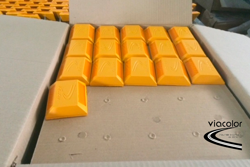 As TACHAS POLIÉSTER COM PINO 45 VIACOLOR são dispositivos de alta eficiência indicados para delinear faixas e/ou pistas de rodovias e vias urbanas, podendo ser aplicados tanto em pavimentos flexíveis (asfalto) como em pavimentos rígidos (concreto). As principais funções das tachas são: delimitar áreas de acesso, complementar a sinalização horizontal, dar maior visibilidade noturna sob chuva e neblina e servir como elementos sonorizadores na separação de pistas. É muito comum a utilização de tachas também como elementos para a redução de velocidade em lugares como garagens e áreas de estacionamento privados, visto que em vias públicas, por determinação do Contran, é proibida sua utilização no sentido transversal a pista. As TACHAS DE POLIÉSTER COM PINO 45 VIACOLOR são fabricadas e disponibilizadas nas cores normatizadas para corpo e lentes refletivas, nas versões mono e bidirecional – outras cores ou formas podem ser feitas sob consulta. Possuem excelente resistência à compressão – superior à Norma e alta retrorrefletância, proporcionando segurança em condições adversas de clima. As tachas VIACOLOR